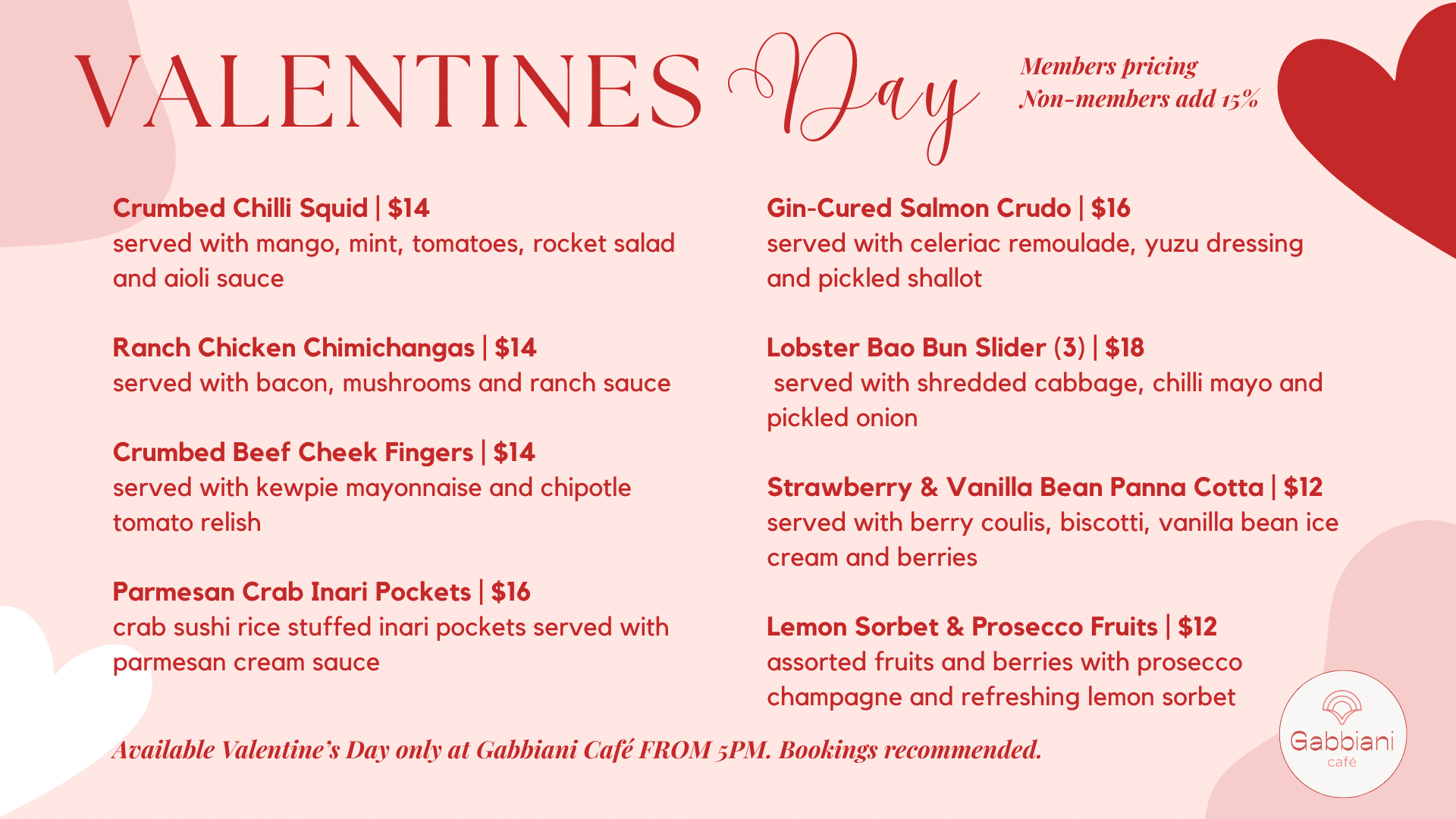 Available Valentine’s Day only at Gabbiani Café FROM 5PM. Bookings recommended.